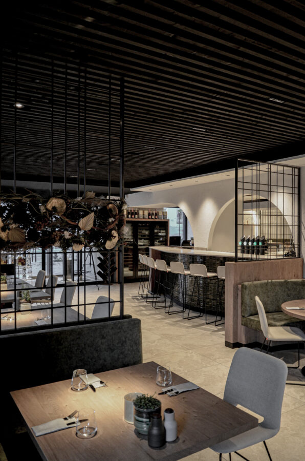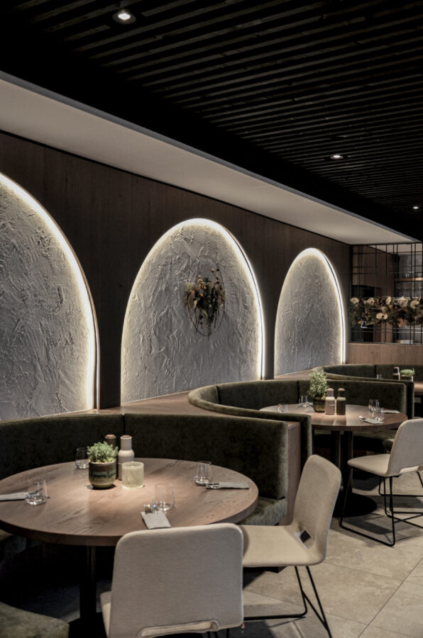 Kraftvolle Details, wie der strukturierte Waschlplutz und die Stahlelemente, zonieren die Bereiche des Restaurants und der Bar.