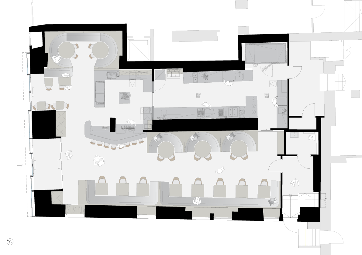 Das Gebäude stammt aus dem 15. Jahrhundert und ist eines der ältesten Gebäude der Kleinstadt. Das statische System war dadurch vorgegeben und die Grundaufgabe bestand zunächst darin, den brachliegenden Flächen einen neuen Nutzen zuzufügen. Vor der Umsetzung des Projektes befand sich eine Geschäftsfläche in den Räumlichkeiten, wobei die Bausubstanz umfassend saniert werden musste. Der große offene Innenraum mit den Fensterflächen im Westen und Norden bildeten die Grundlage für die Entwurfsplanung. Teilweise wurden meterdicke Mauern durchbrochen, um die Fensterflächen zu vergrößern oder neue Öffnungen zu generieren. Dadurch wurde der Naturstein der Bestandsmauern freigelegt, welcher im Garderobenbereich in Szene gesetzt wurde.