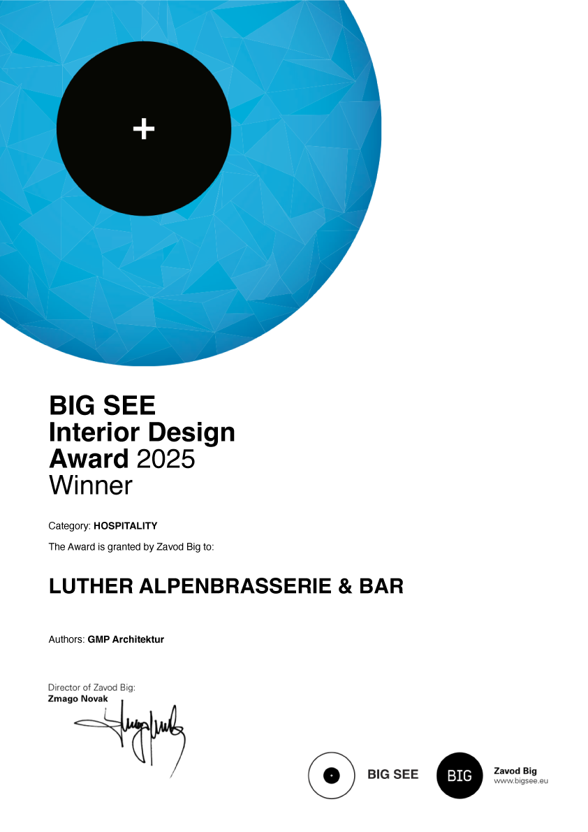 Unter dem Namen Luther Alpenbrasserie & Bar wurde in Schladming ein Restaurant geschaffen, welches die authentisch österreichische Küche mit Einflüssen aus der Alpe-Adria-Region neu interpretiert. Entstanden ist eine Atmosphäre mit stillvollem Ambiente passend zur österreichischen Gemütlichkeit. Der Wohnzimmerflair sollte in den Vordergrund rücken und den Gästen ein gemütliches Einkehrerlebnis bieten, welches in Erinnerung bleibt.